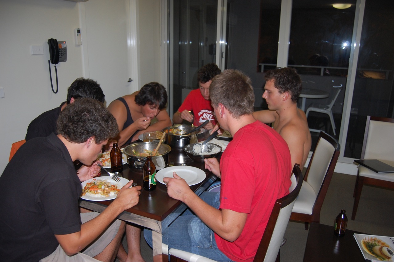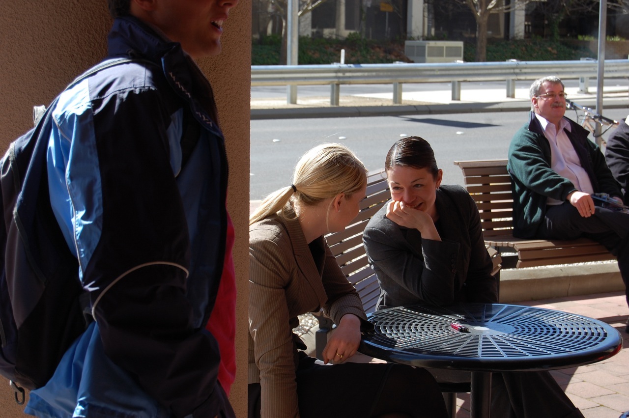 Ob prigrizku in pijači na račun davkoplačevalcev smo veselo kramljali o prednostih in slabostih življenja v Avstraliji, kulturi vožnje, ogromnih razdaljah, tipično slovenskimi prepiri med klubi v različnih mestih in našem dosedanjem potovanju. Tu in tam smo prekinili pogovor in ostalim prisotnim diplomatom ter poslovnežem, ki so ravno takrat nič hudega sluteči srkali kavo, zapeli košček našega repertoarja.